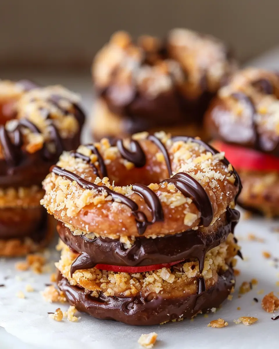Finally, it’s time to drizzle that beautiful chocolate over your Apple Samoas. Using a spoon or a piping bag, create artistic swirls or crisscross patterns on top of each assembled apple slice.