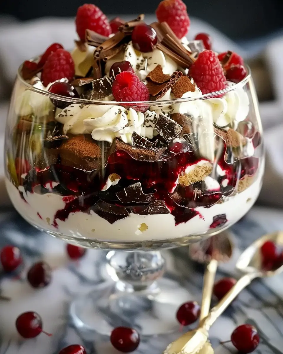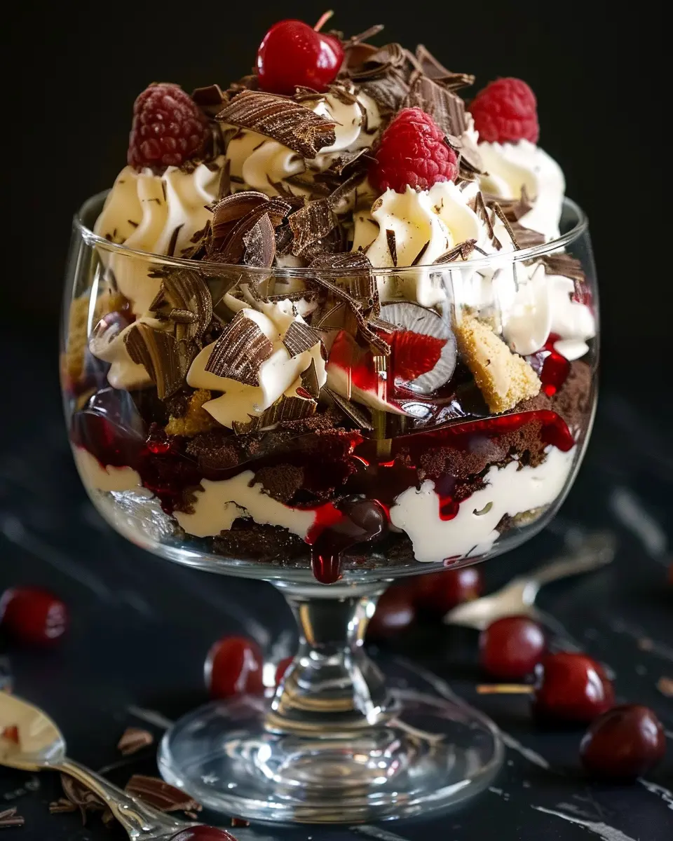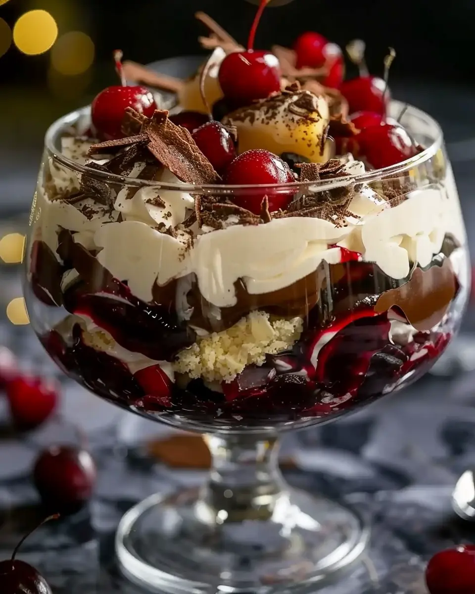 This Black Forest Trifle is a decadent dessert that combines layers of chocolate cake, whipped cream, and cherries, perfect for any celebration.