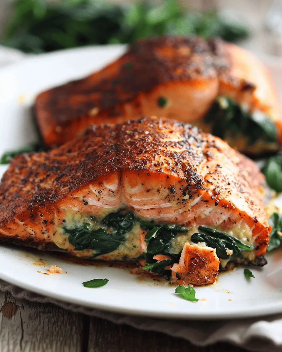 Blackened salmon is a cooking technique that infuses the fish with bold flavors through a blend of spices, typically including paprika, cayenne pepper, and garlic powder. The result? A crispy, charred crust that encapsulates the rich, buttery taste of the salmon inside. This method not only enhances the salmon but offers a delicious contrast to the creamy spinach and the salty kick of Parmesan cheese that you’ll find stuffed within.