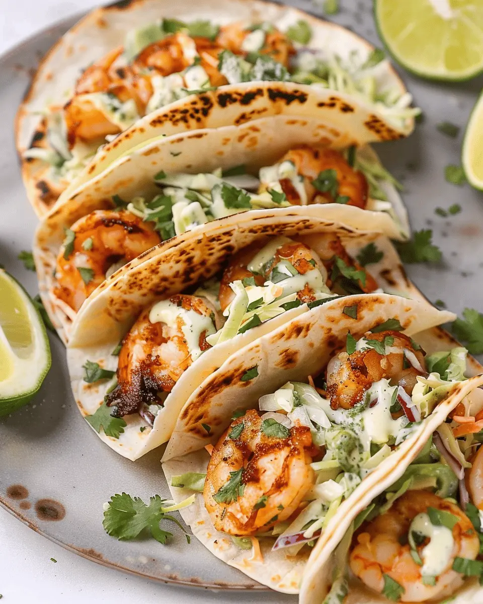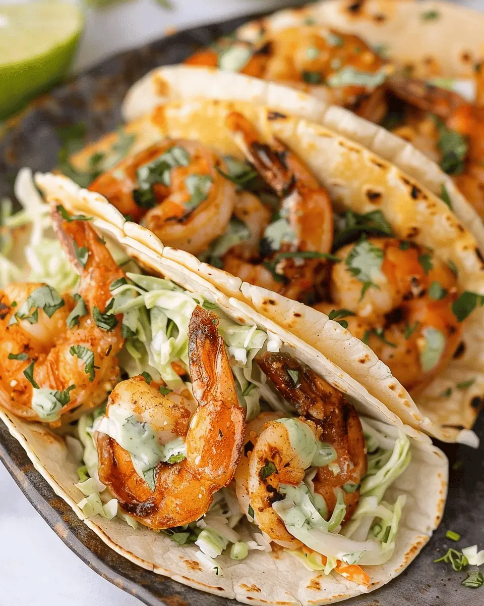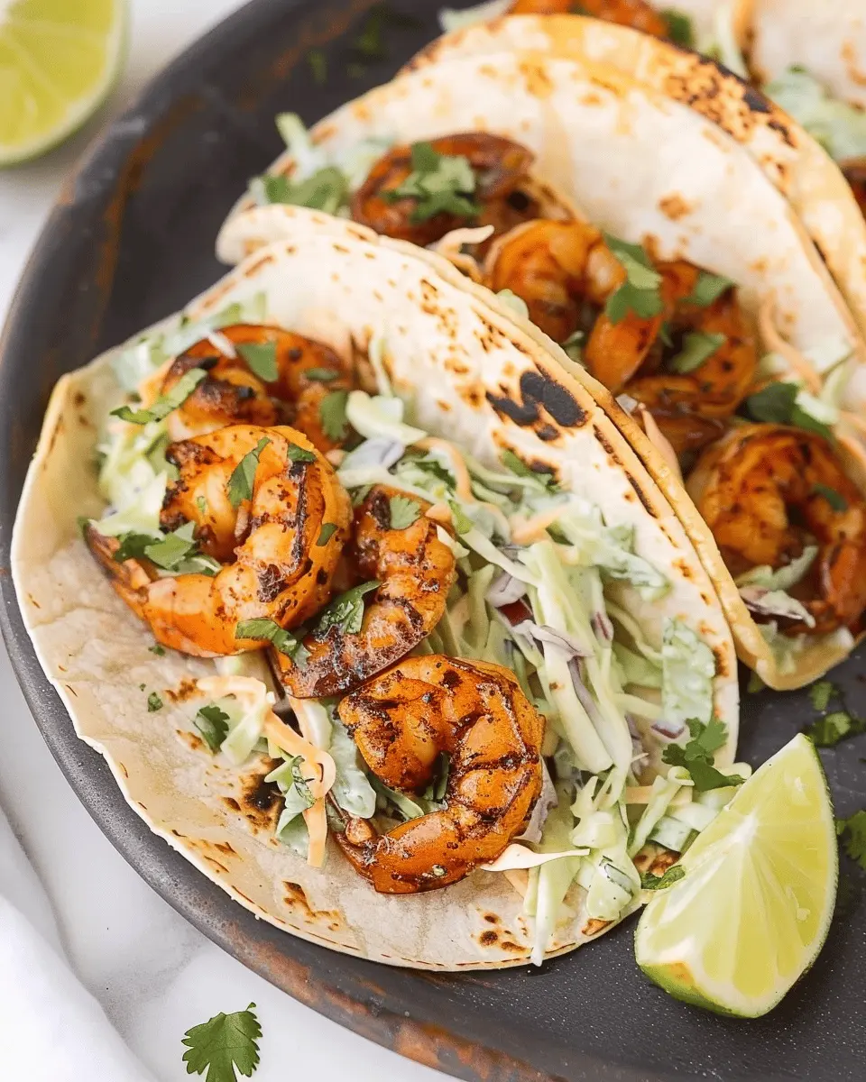 The balance of flavors in every bite—tangy slaw, zesty shrimp, and the warmth of the tortilla—will surely make these tacos a hit!