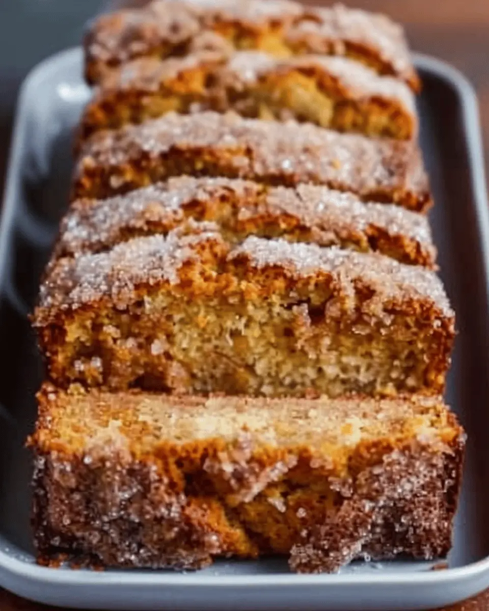 A delightful and moist bread perfect for fall, infused with pumpkin and topped with cinnamon sugar.