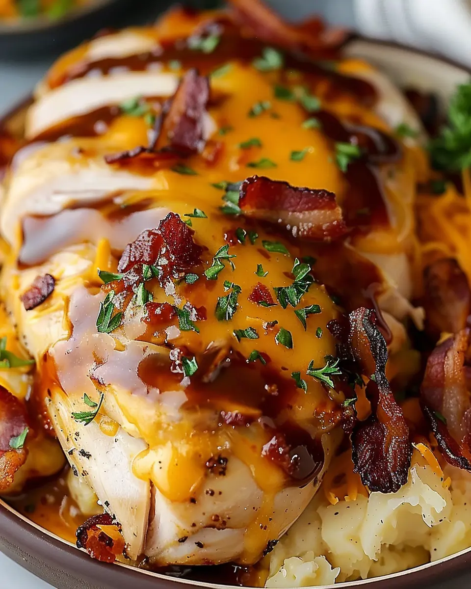 Enjoy a delicious twist on a classic dish with this Cowboy BBQ Turkey Bacon Cheddar Chicken recipe, packed with flavor and juiciness.