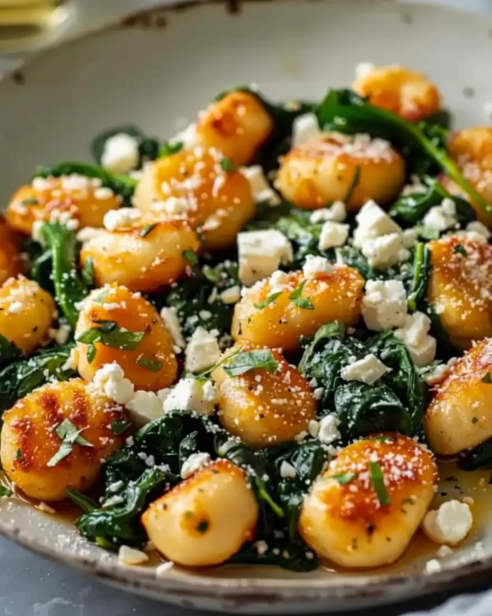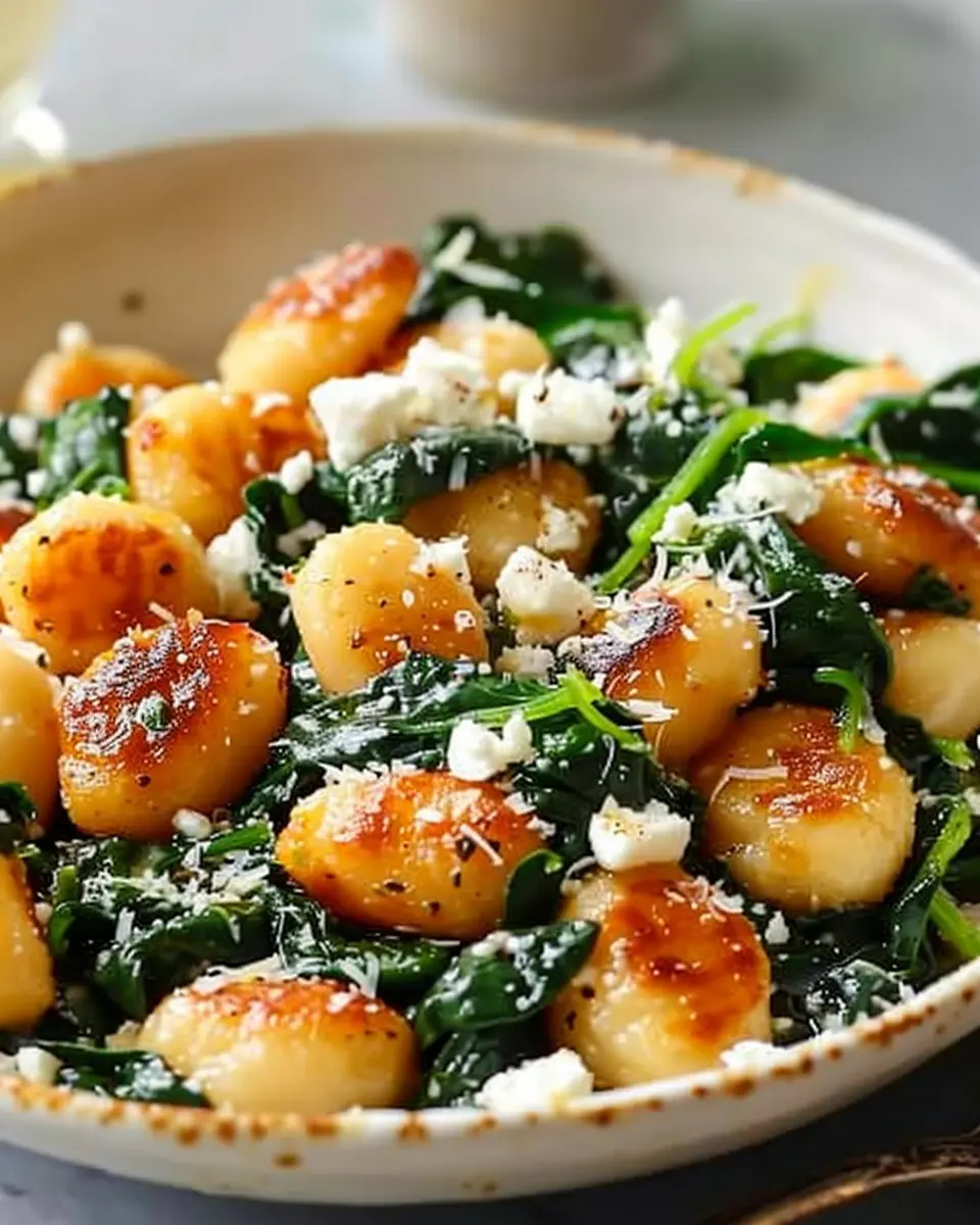 A delicious and easy recipe for crispy gnocchi tossed with fresh spinach and tangy feta cheese.