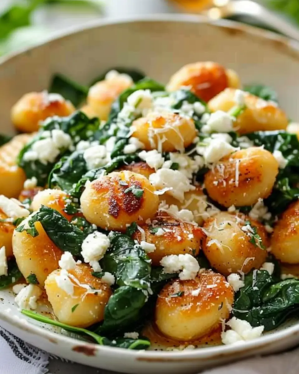 Presentation can make all the difference! Serve your crispy gnocchi with spinach and feta in a colorful bowl, garnished with freshly chopped parsley or dill. Adding crumbled feta on top right before serving provides a delightful burst of flavor and a pop of color. Emphasize the green from the spinach and colorful toppings, creating a visually appealing dish that’s just as enticing as it is delicious.