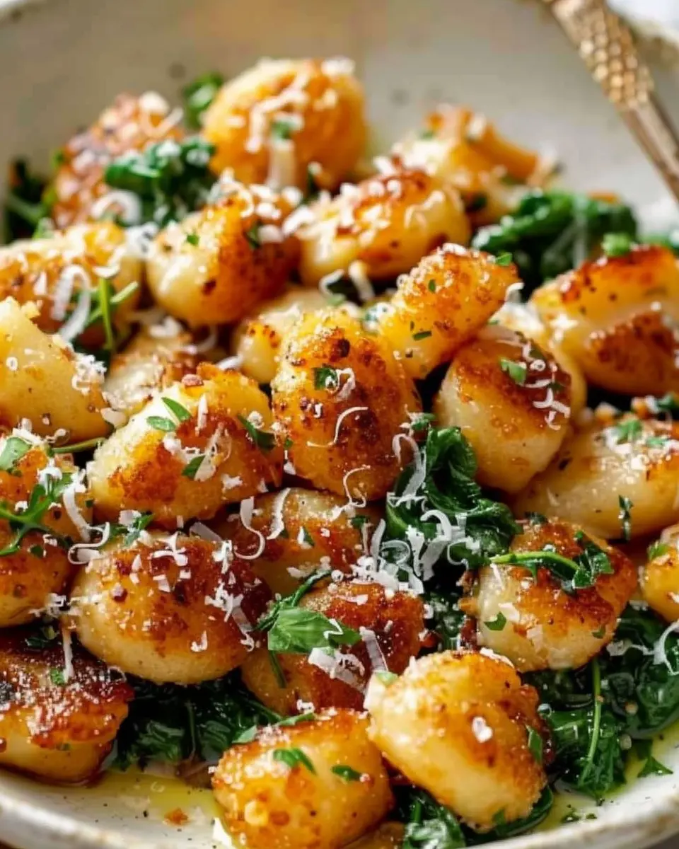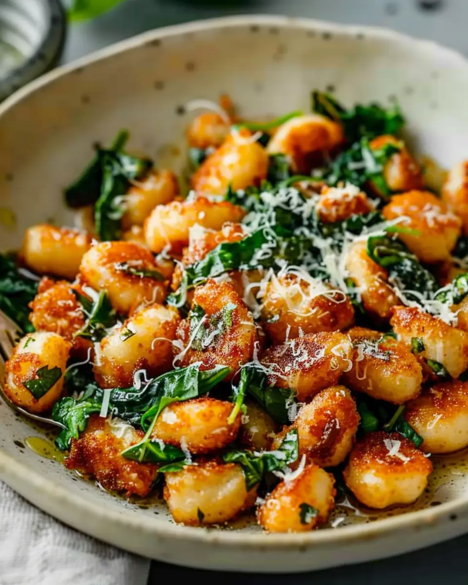 - Plate the crispy gnocchi: Start with a base of the crispy gnocchi, then artfully arrange the garlic and spinach on top.