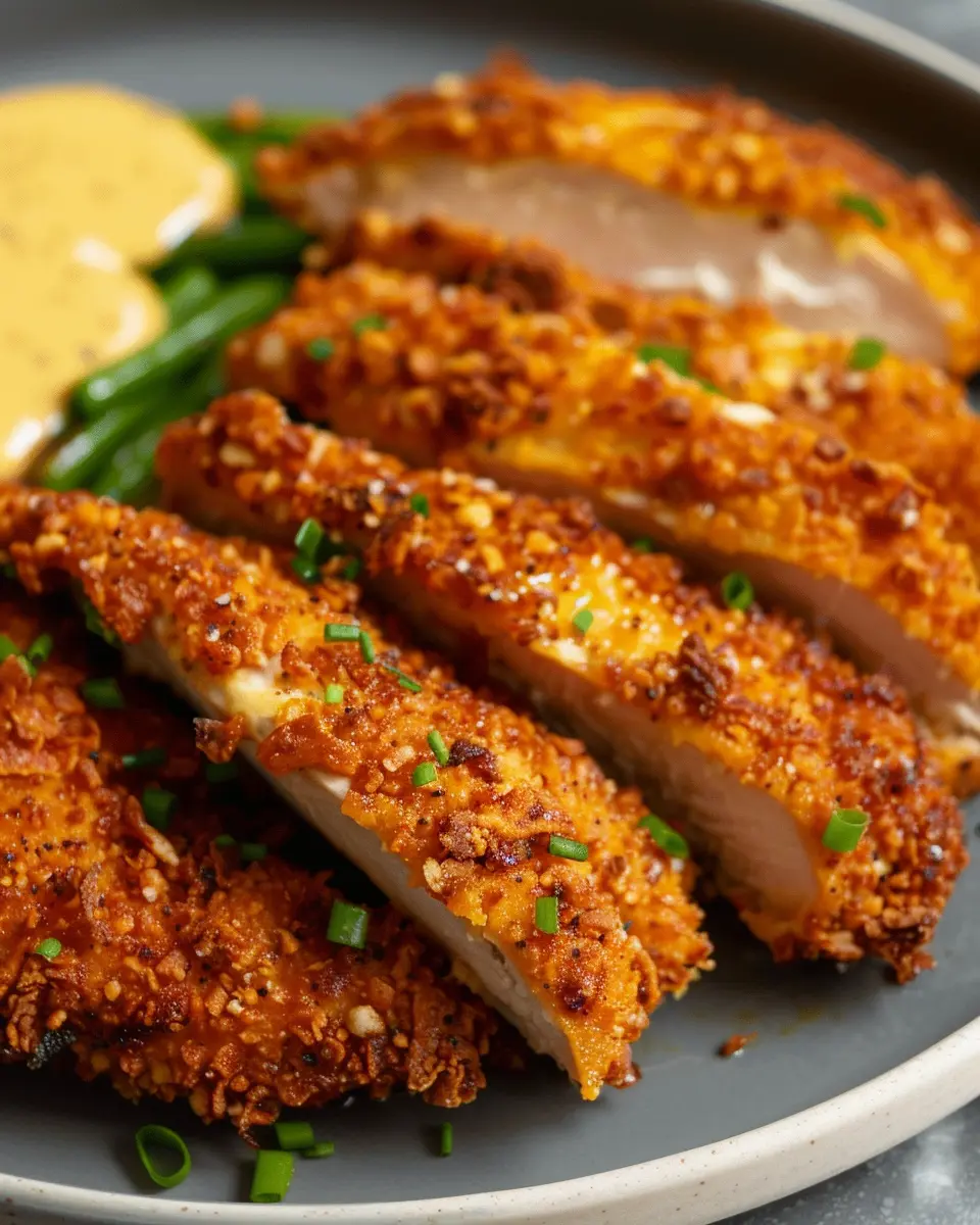 Deciding whether to bake or pan-fry your crispy pretzel crusted chicken really depends on your preference. For baking, preheat your oven to 400°F (200°C). Line a baking sheet with parchment paper, drizzle a little olive oil, and place the coated chicken on top. Bake for about 20-25 minutes or until the chicken is golden brown and reaches an internal temperature of 165°F (75°C).