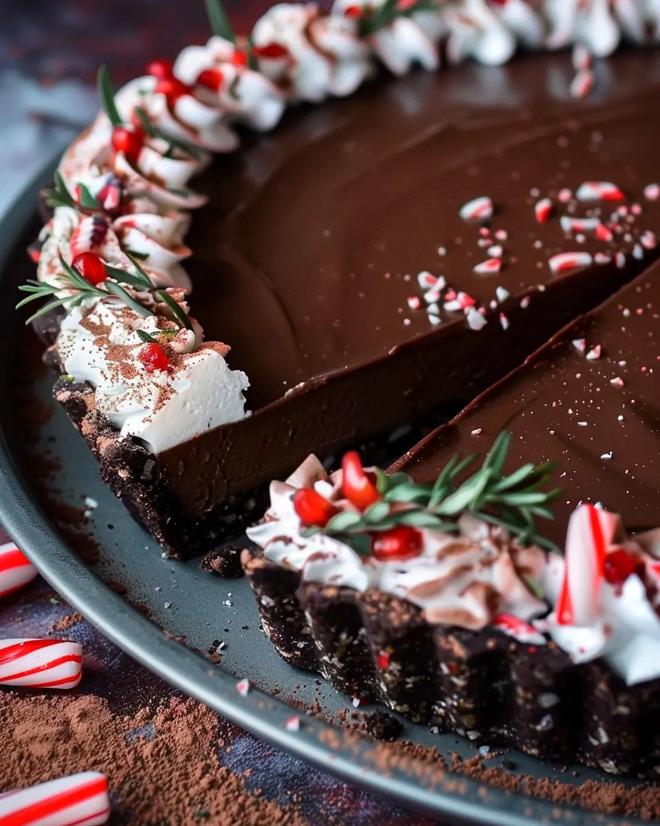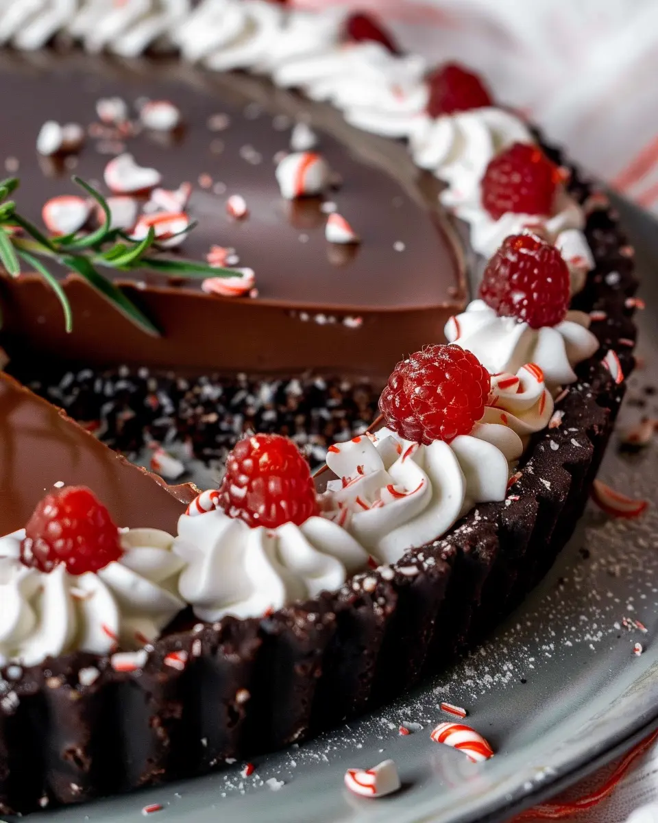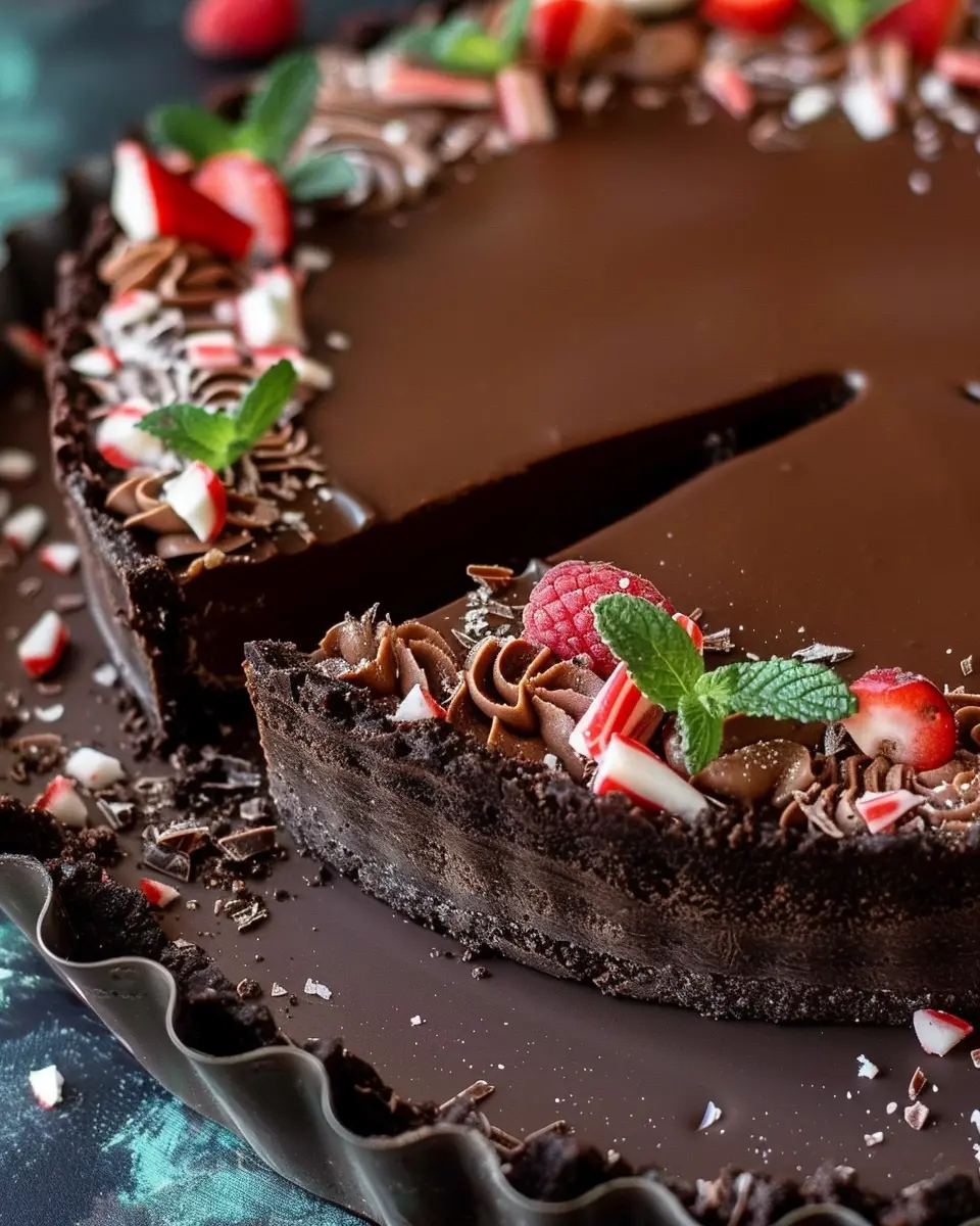 Keywords: Dark Chocolate Peppermint Mousse Tart, festive dessert, holiday dessert