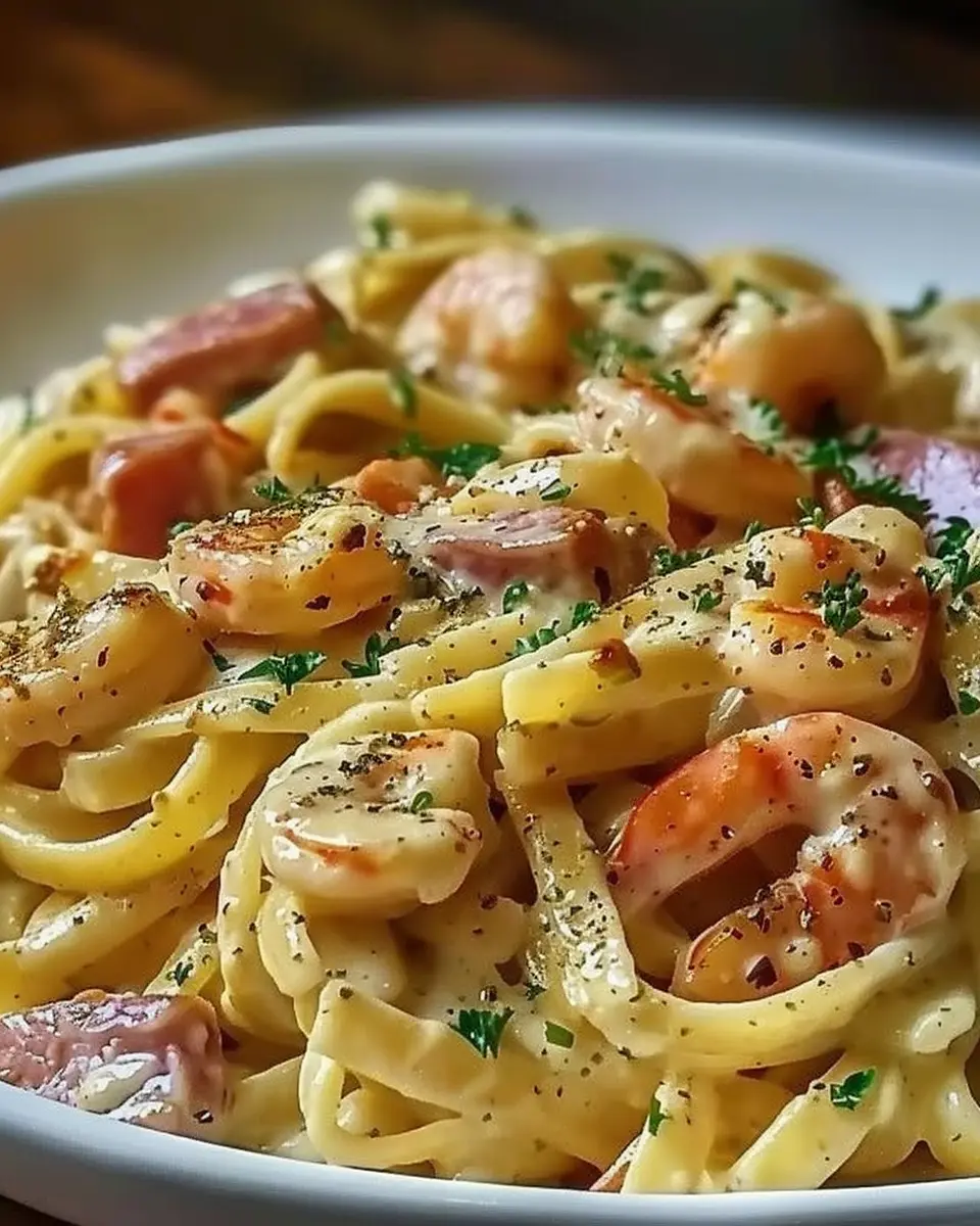 A delicious and savory pasta dish inspired by Pappadeaux, featuring turkey bacon and chicken ham.