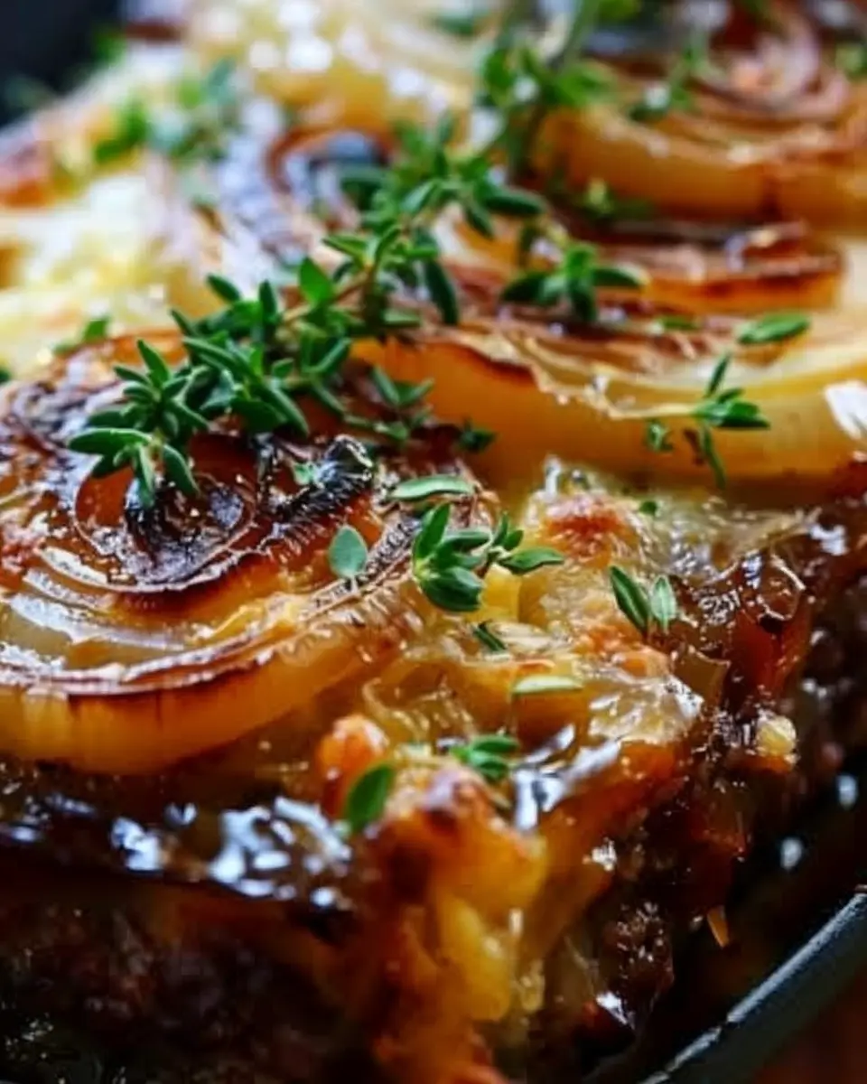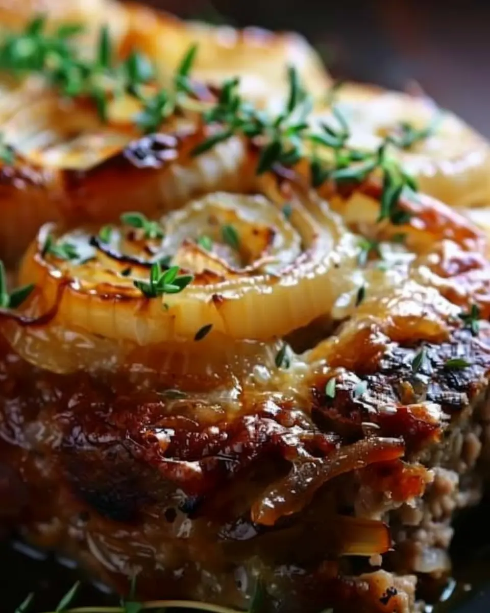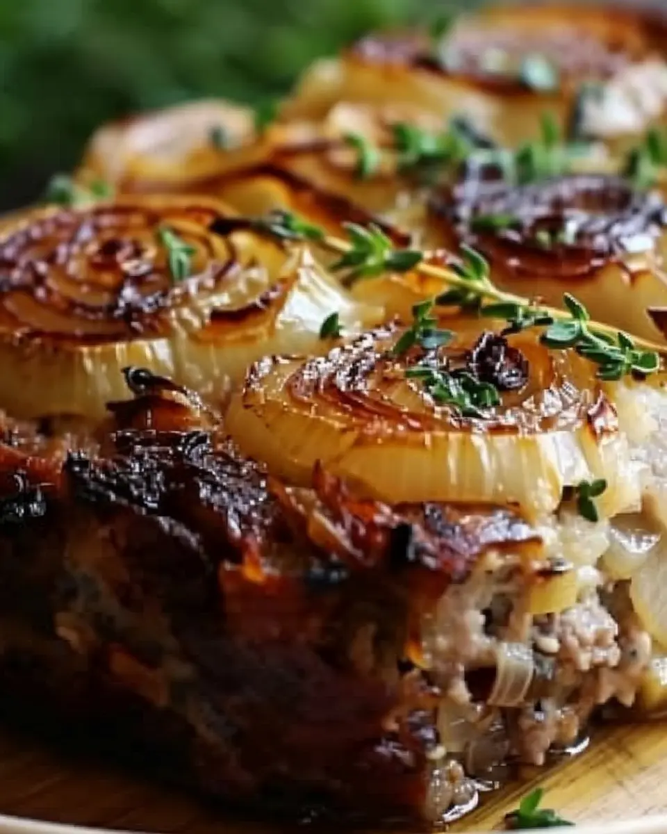 PrintFrench Onion Meatloaf: Juicy Comfort Food with Turkey Bacon