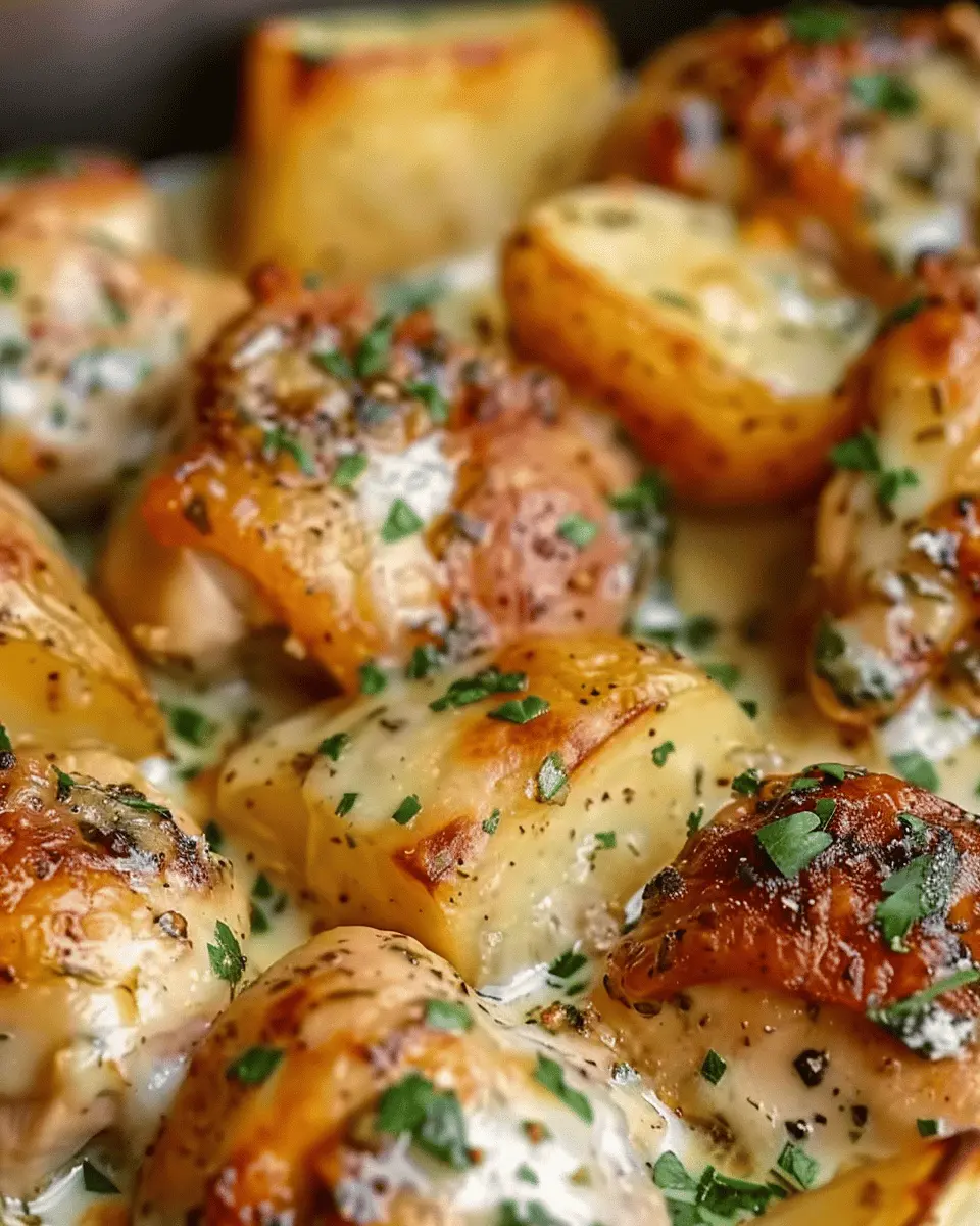 Once your meal is ready, carefully remove the chicken and potatoes and place them on a serving platter. Give some love with a sprinkle of fresh parsley and that reserved parmesan cheese for a touch of elegance.