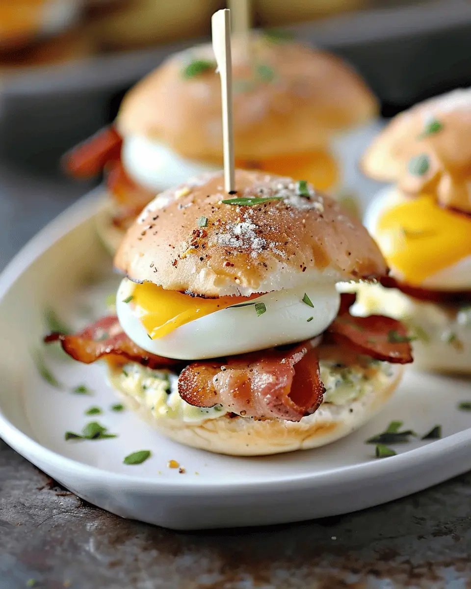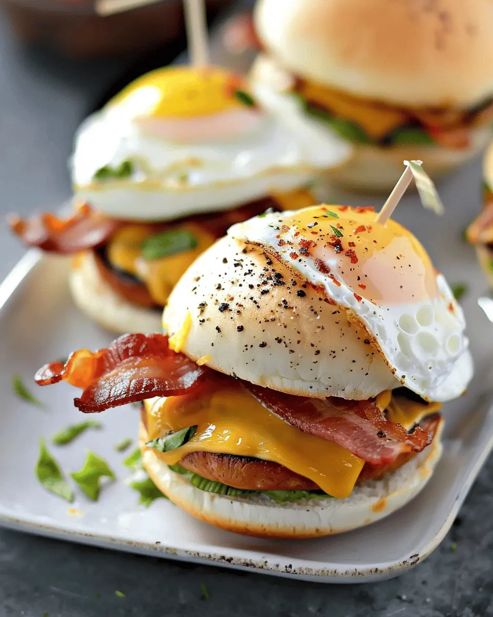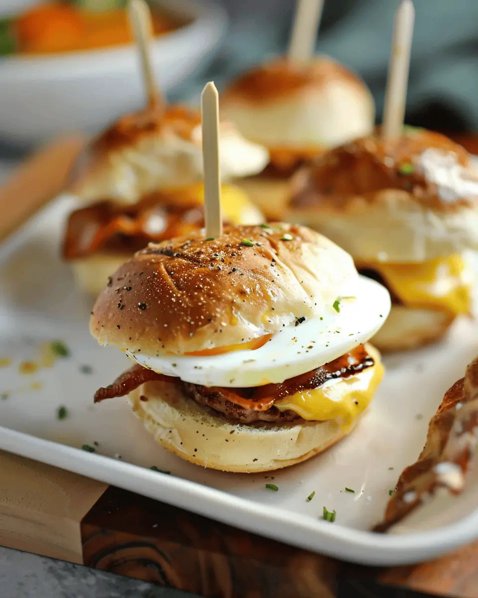 - Assemble the sliders by placing a slice of bacon, followed by scrambled eggs, and topped with cheese inside each slider bun.