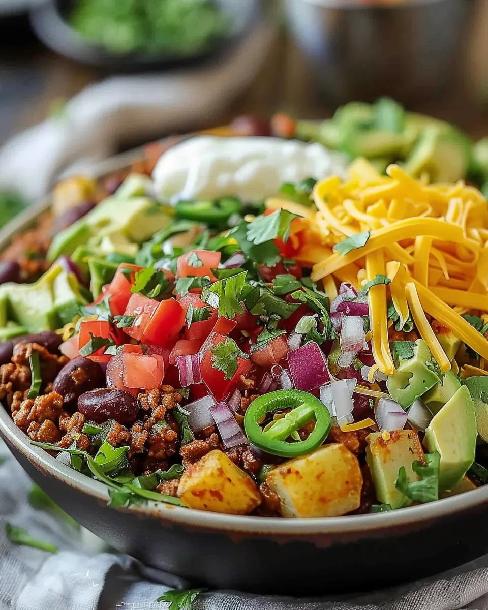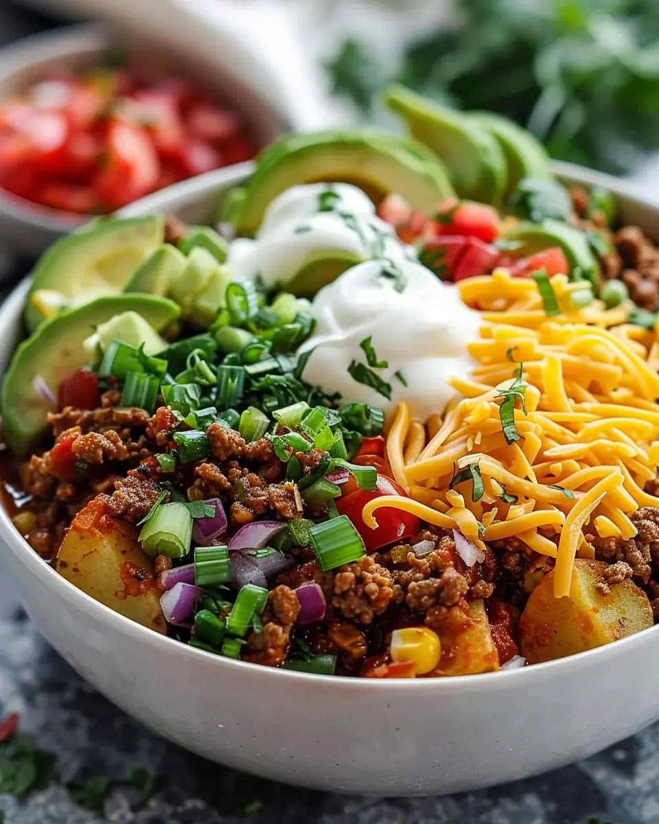 The loaded potato taco bowl is a delightful fusion of flavors that brings comfort food to a whole new level. With its crispy potatoes, savory toppings, and vibrant garnishes, it’s not just a meal; it’s an experience. Why will you love it?