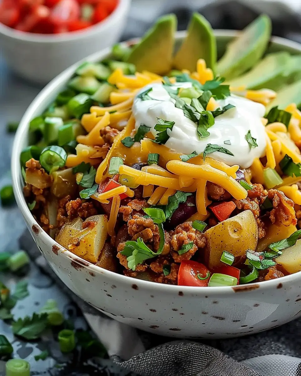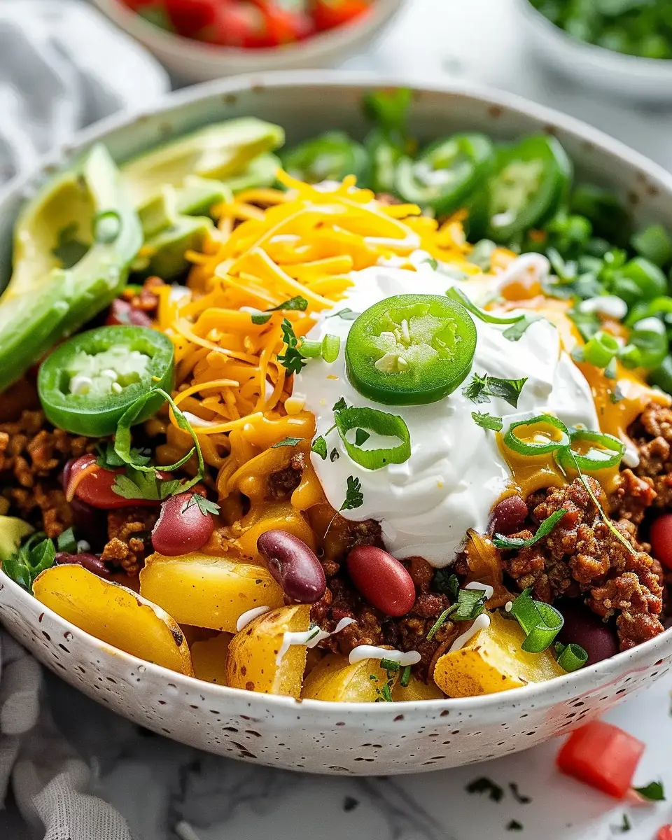 Customization is the name of the game with a loaded potato taco bowl. Want a kick? Add jalapeños or use spicy salsa. Prefer a milder dish? Stick to fresh herbs like cilantro or parsley. You can also switch up the potatoes for sweet potatoes for a healthier twist or use cauliflower for a low-carb version.