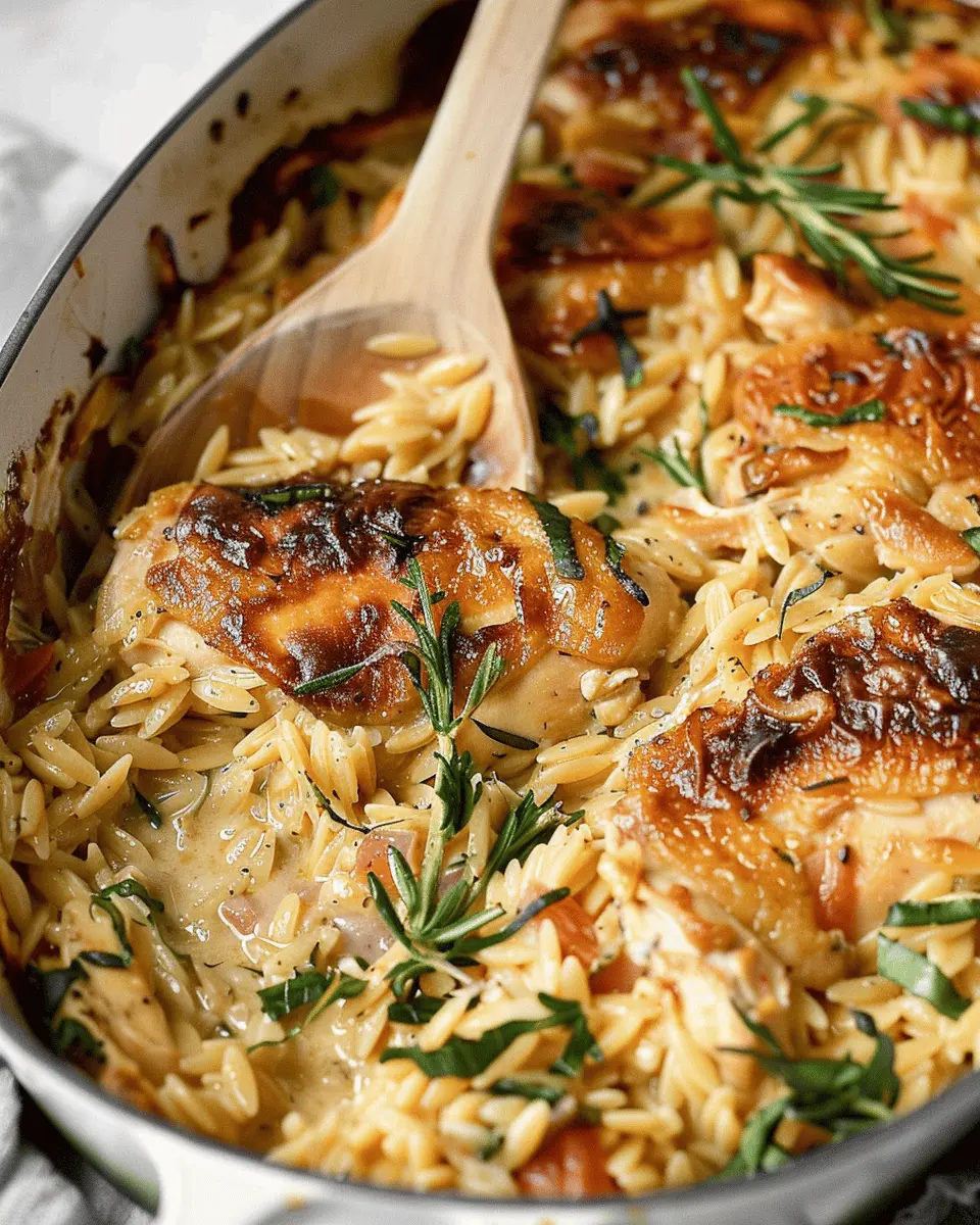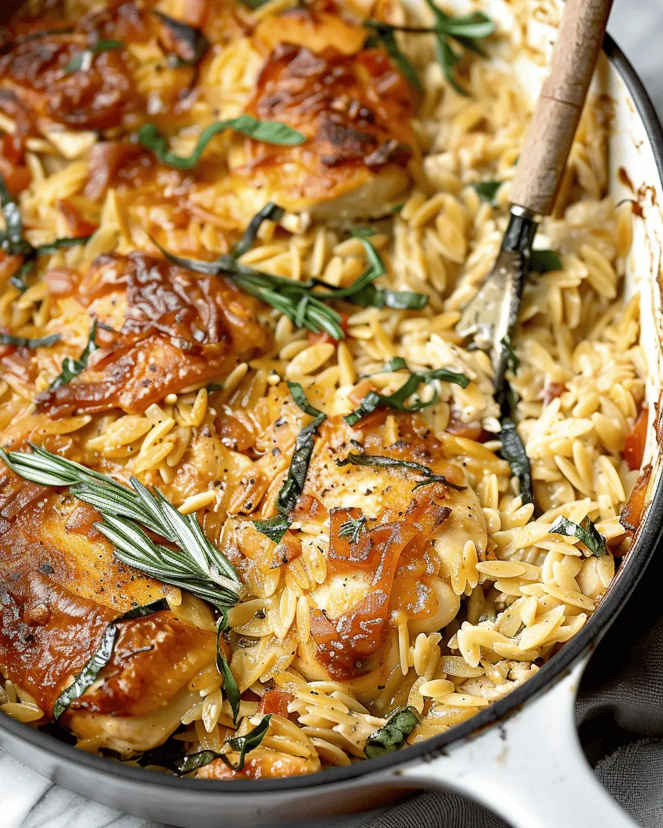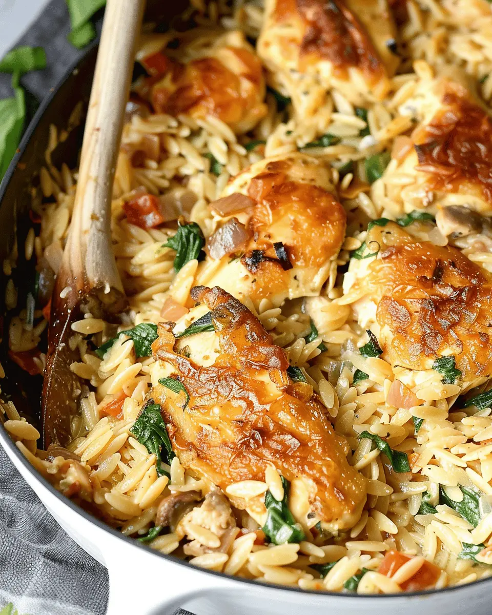 A delightful one-pan dish featuring tender chicken and flavorful orzo.