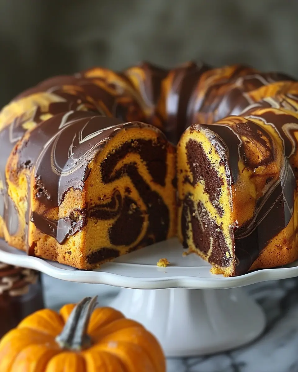 Delight in the flavors of fall with this Pumpkin Marble Cake, perfectly blending pumpkin and chocolate for a decadent dessert.