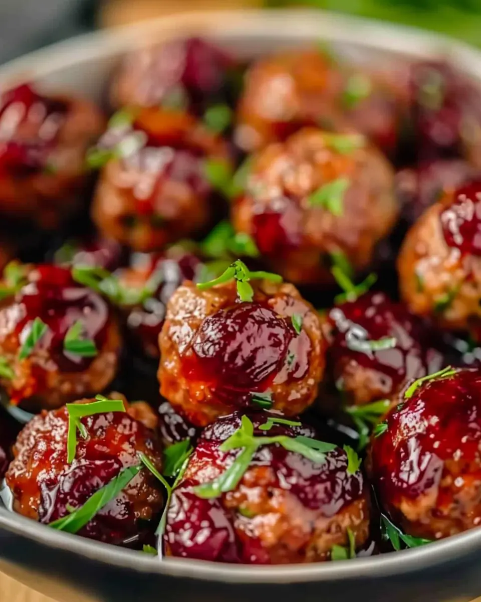 Delicious turkey bacon meatballs coated in a sweet and tangy cranberry sauce, perfect for holiday gatherings.