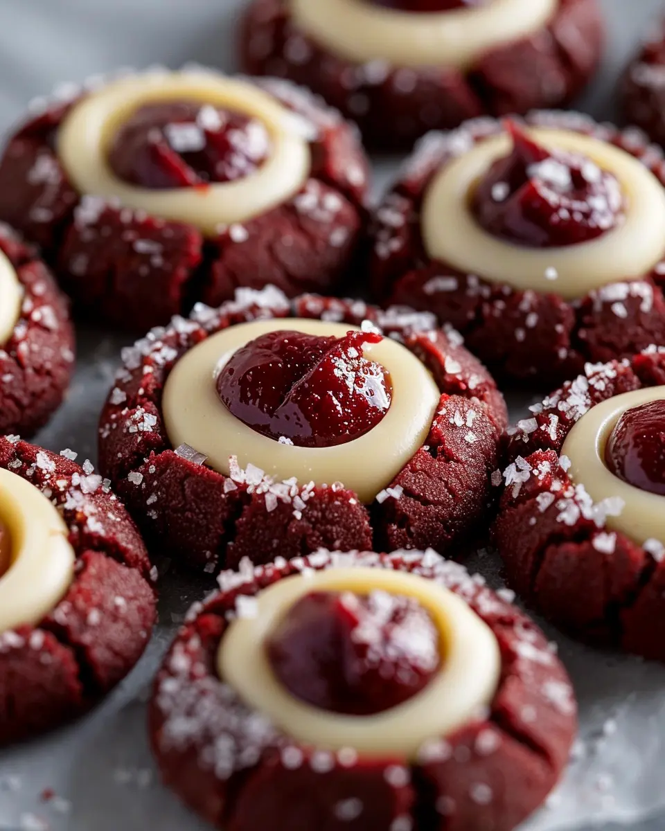 Enjoy these delectable Red Velvet Cream Cheese Thumbprint Cookies, a delightful treat that is perfect for any occasion.