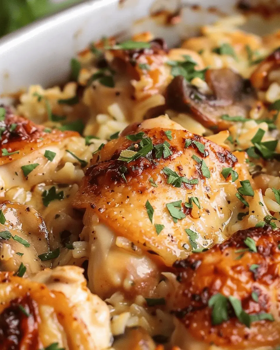 Cover your casserole with foil and pop it into the preheated oven. Bake for about 25–30 minutes, or until the chicken is cooked through and the rice has absorbed all the flavors (about 165°F internal temperature for the chicken). If you’re feeling adventurous, you could uncover the dish for the last 5 minutes to allow the top to brown slightly.