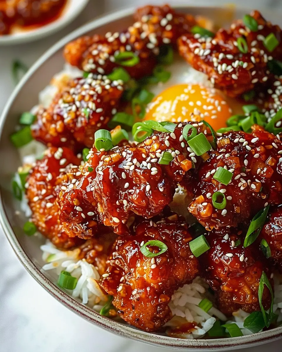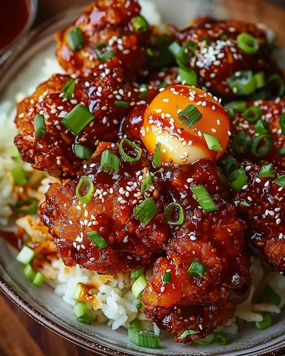 - Top it off: Layer the sticky Korean fried chicken on top of the rice.