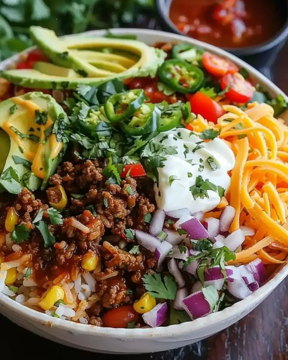 Are you a spice aficionado? Then you’ll love this spicy taco rice bowl! Start with your base of seasoned rice, then layer in ground beef or turkey. Now for the heat—slice up some fresh jalapeños and toss them in! You could also use pickled jalapeños if you prefer a tangy twist. Don’t forget to finish it off with spicy salsa or a jalapeño-infused hot sauce to really ignite those flavors.