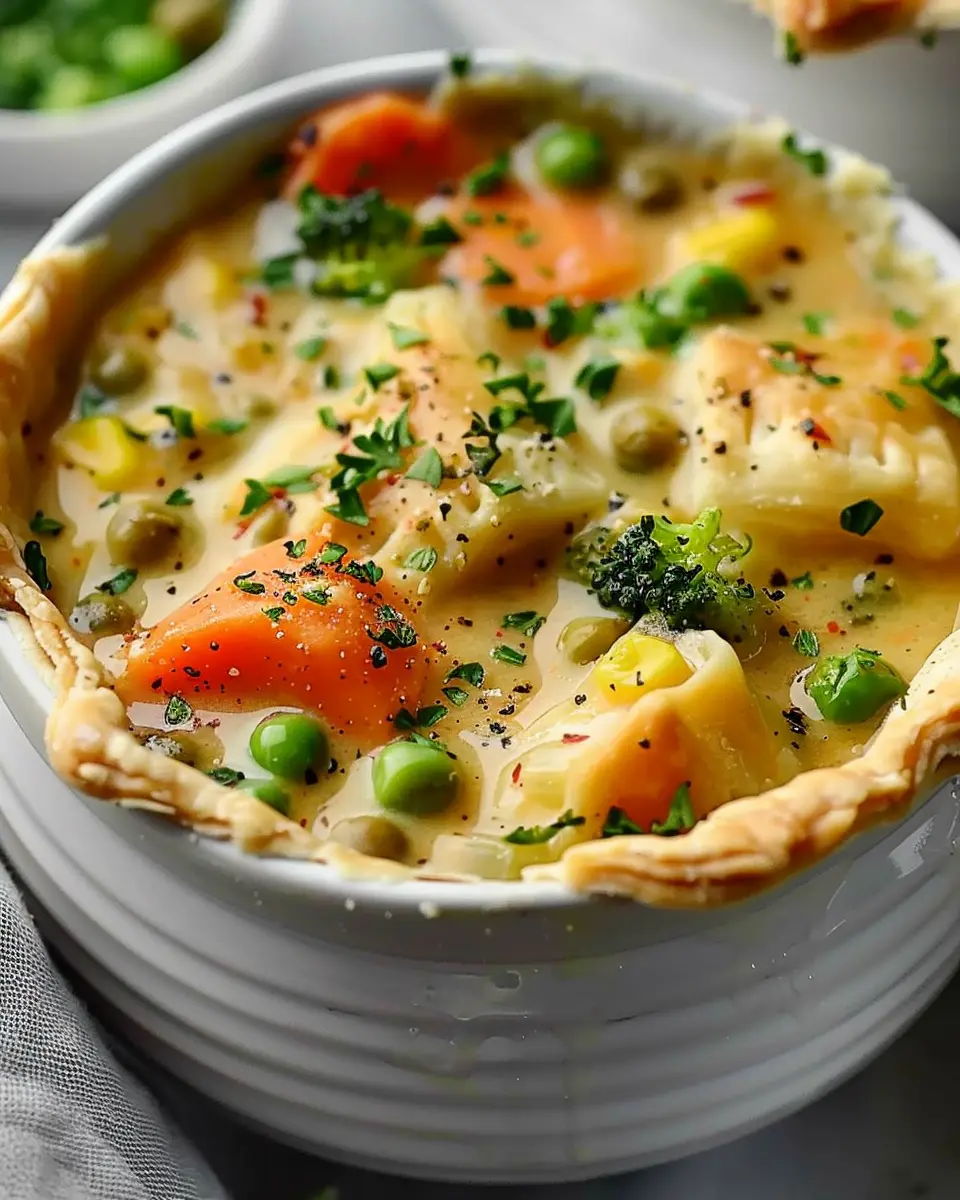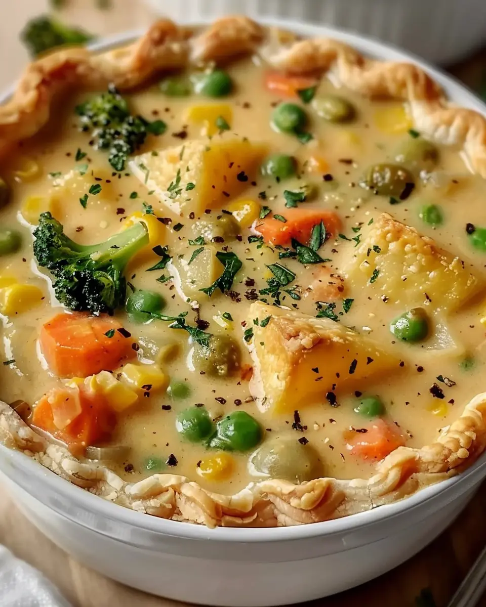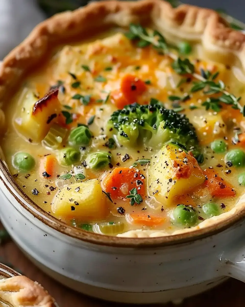 A warm and hearty Veggie Pot Pie Soup filled with fresh vegetables and comforting flavors.